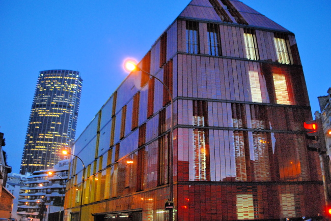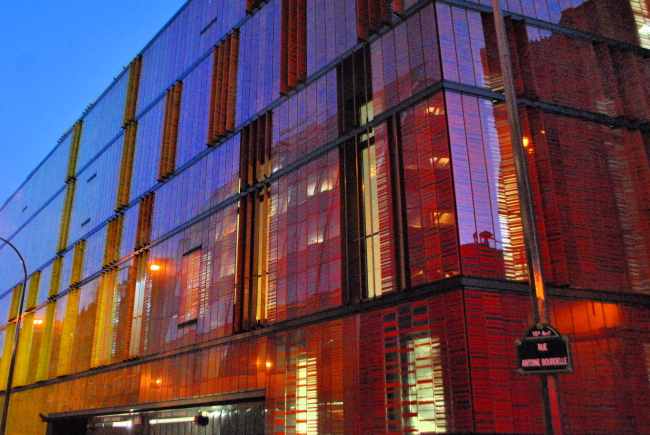 Když jsem tady byla minule, na křižovatce rue Falquière a rue Antoine Bourdelle stála stavební ohrada, za kterou bylo vidět jen hlubokou jámu. Dnes na tomto místě vyrostla nová budova, kterou kdyby viděl Václav Klaus, tak se v tu ránu přiváže k nejbližšímu bagru. Mně se naopak líbí. Chtělo by to ovšem denní světlo, abychom mohli ocenit všechny barevné odstíny skleněné fasády.