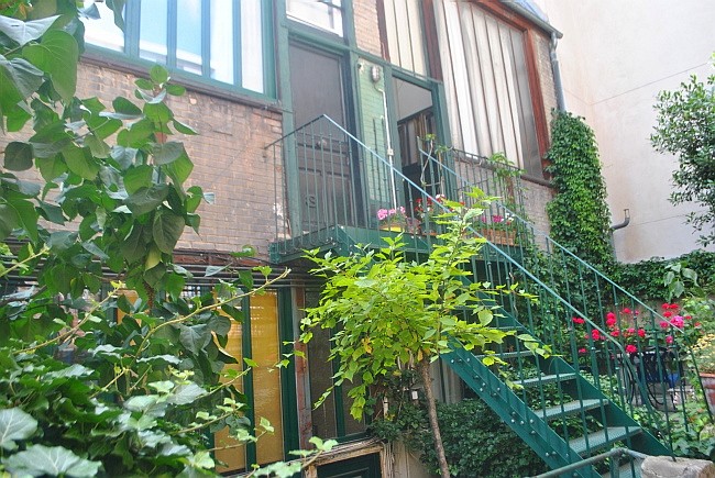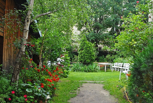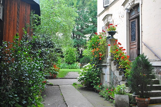 Pokud budete mít štěstí, otevřou se před vámi dveře domu přímo naproti parku a na jeho dvorku najdete další starý dům s hezkou fasádou a zahrádkou, porostlou růžemi