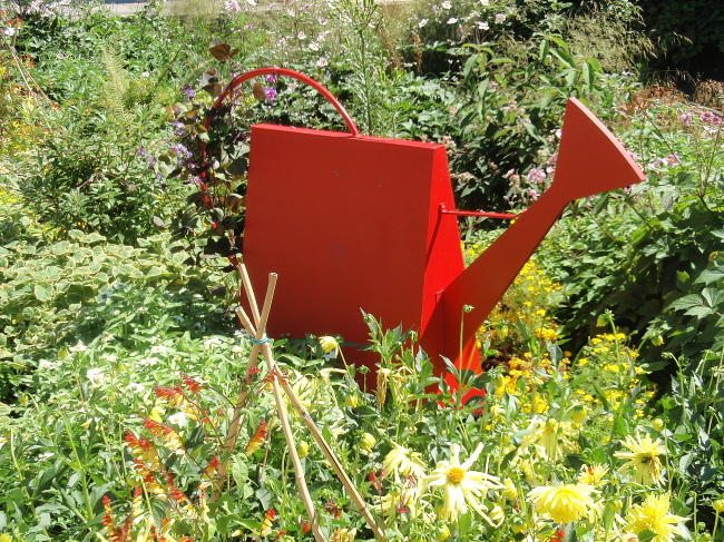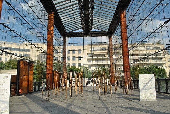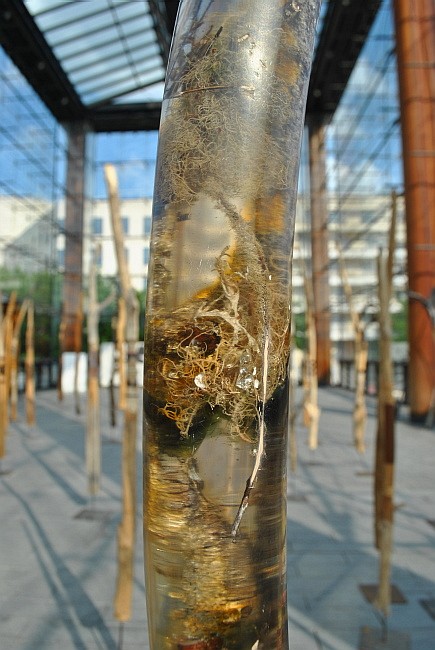 V jednom ze skleníků právě vystavuje Luc Jacquet svoji expozici, skládající se z různě opracovaných klacíků (nevím, jak bych to řekla vznešeněji), uprostřed nichž je v průhledné plastové části ve vodě umístěno podivné smetí (taky mě nenapadá odbornější výraz) – nejrůznější drátky, větvičky, listí, mech nebo jiné neidentifikovatelné předměty. Je to zajímavé, ale vedro, které ve skleníku panuje, stejně nedovolí si to všechno prohlédnout podrobně.