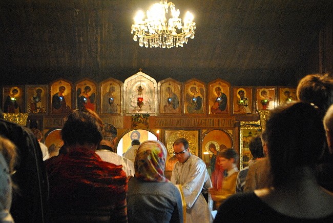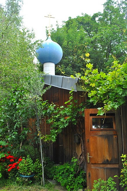 Prostor uvnitř je maličký a při mši, sloužené rusky a francouzsky, se v něm tísní mnoho lidí. Nebudeme rušit a raději se podíváme na zahradu, dokud tam nikdo není.