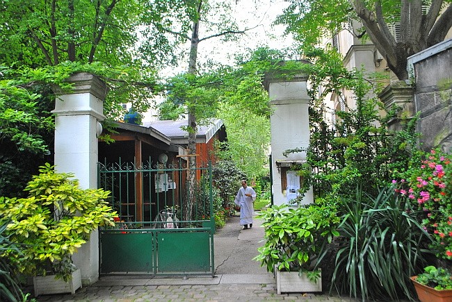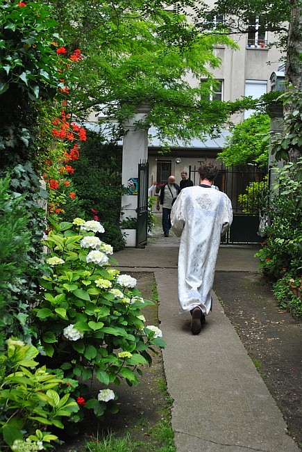 Na první pohled byste v té rušné ulici v 15. obvodu nehledali nic zajímavého, natož pravoslavný kostel. Je skrytý ve vnitrobloku a dostaneme se k němu průjezdem činžáku a přes dvůr, lemovaný nízkými domky ze začátku minulého století, obrostlými vistáriemi a psím vínem a obklopenými květinami. Až na konci dvora se za železnou mříží skrývá cíl naší dnešní cesty.