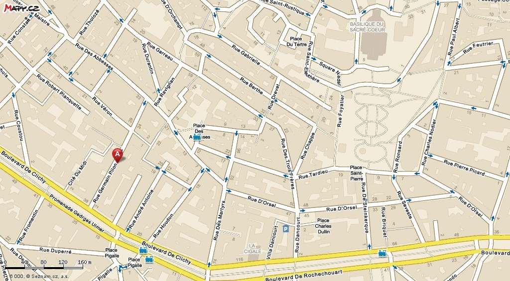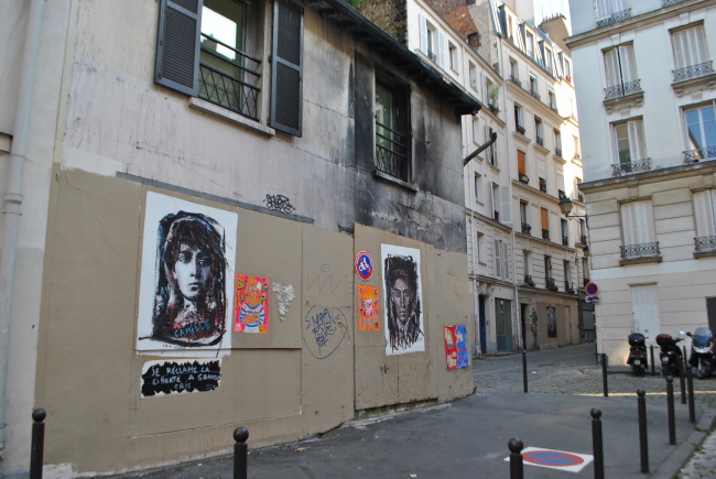 Rue Norvins by nás přivedla do těch nejrušnějších částí turistického Montmartru, tam však správní pokročilí Pařížané chodí jen brzy ráno, když tam není ani noha, proto teď odbočíme vlevo do rue du Mont Cenis, která nás mezi vysokými kamennými opěrnými zdmi přivede do rue de l´Aubrevoir ke slavnému růžovému domku. Od něj se vydáme směrem dolů k place Dalida.