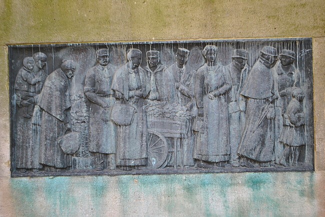 Pod sousoším zamilované dvojice jsou na pomníku umístěny dva basreliéfy – ten vlevo představuje ženy, děti a vojáky společně s trhovci, zatímco ten vpravo oslavuje dělníky a horníky