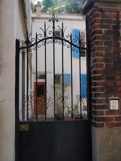 Strmá rue Burq končí u zadní strany domů v rue Lepic, která se nad ní tyčí ve výšce. Vchod do parku je tou kovanou železnou bránou vpravo.