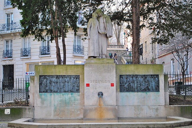 Pomník, který dnes zdobí kašnu na náměstí, navrhl Pierre Vanier v roce 1936. Je věnován švýcarskému grafikovi a litografovi Théophilu-Alexandrovi Steinlenovi, naturalizovanému Pařížanu a obyvateli blízké rue Caulaincourt, jehož hrob, jak si vzpomínáte, jsme viděli minule na hřbitově. Jeho jméno není nijak zvlášť známé, určitě ale znáte jeho nejproslavenější dílo.