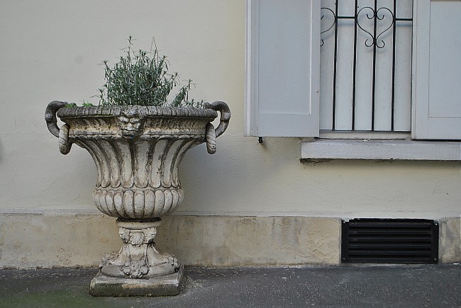 První dvůr, s kamennými vázami, litinovou fontánou, okny s bílými dřevěnými okenicemi a tepanými mřížemi. Druhý dvůr, bohužel, je plný parkujících aut.