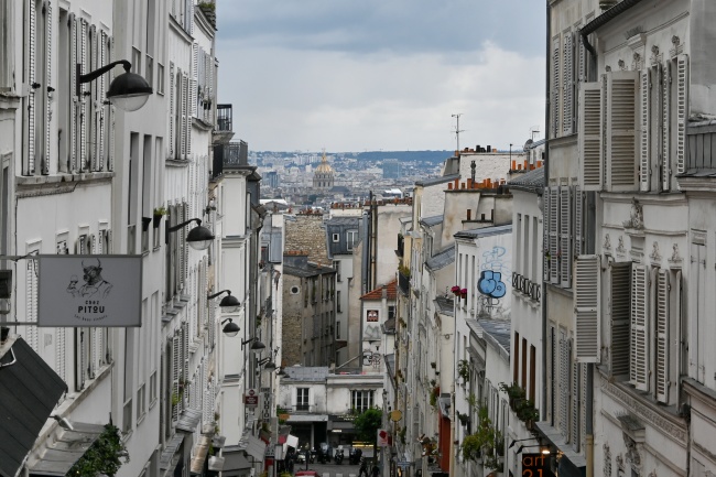 Když se podíváme z horní části ulice od mlýna směrem k centru, za hezkého počasí se nám v průzoru mezi domy objeví jako na dlani část centra. Říkám v hezkém počasí, což rozhodně není tento případ – tady se dá v mlze na obzoru jen tušit kopule Invalidovny.