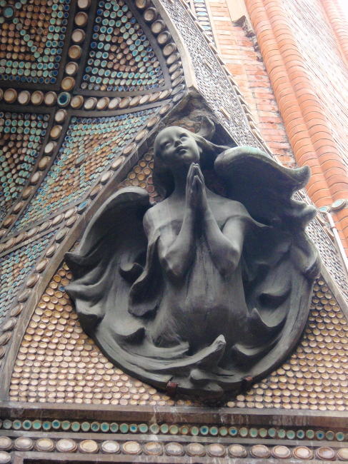 Detail vstupu zdobený keramikou a sochami, které vytvořil Pierre Roche