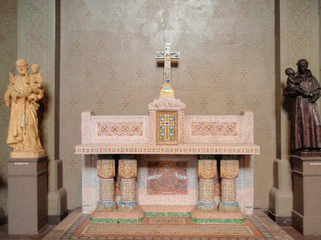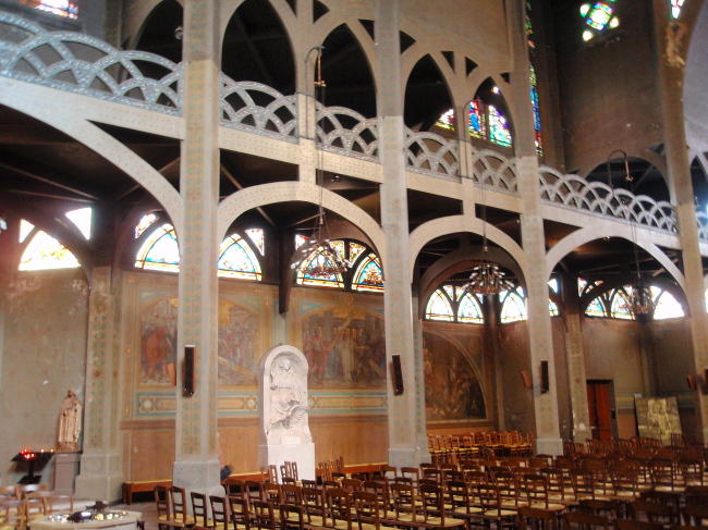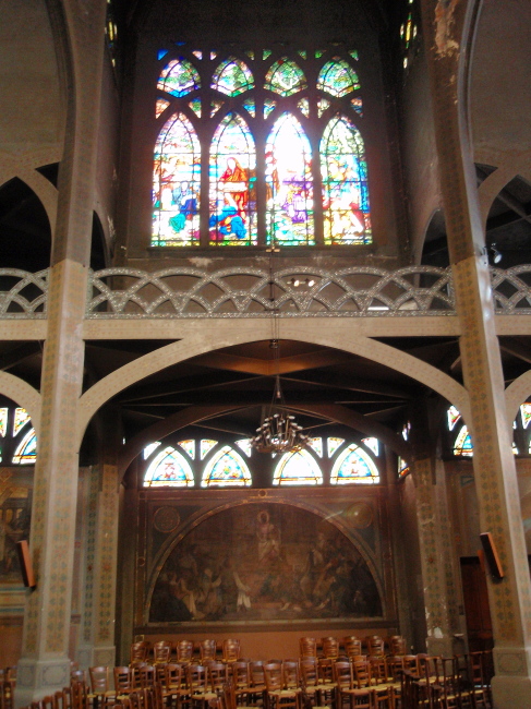 I přes šedou barvu použitého betonu kostel nepůsobí nijak industriálně. Jeho secesní výzdoba mu společně s velkými okny a ohromným prostorem dodává lehkost. A kdybych tam sebou měla lepší foťák, tak by bylo vidět krásné vitrážové okno v chóru, znázorňující Ukřižování.