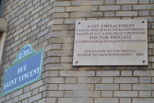 Ten druhý dům bychom našli, pokud bychom sem přišli před sto lety, v místech dnešního vysokého domu vpravo pod schody, na rohu rue du Mont Cenis a rue Saint-Vincent, a bydlel v něm hudební skladatel Hector Berlioz. Jak je vidět, už na přelomu století na něm byla umístěná Berliozova pamětní deska – tu najdeme dodnes i na dnešním domě.