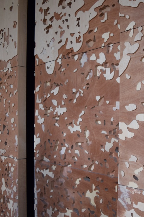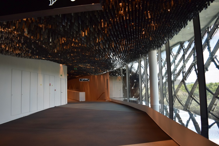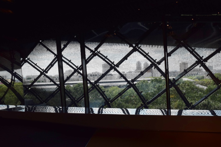Ve 3. patře se dá pokračovat stejnou promenádou stále dolů až do parku, kam se střecha sklání, byla by to však škoda, protože právě na této úrovni je umístěno prolamované a zvenku neprůhledné okno, vytvořené z desítek jemně perforovaných nerezových plechů, které se vám vlní nad hlavou. Stojí proto za to si tady budovu po celé přední straně obejít a prohlédnout.