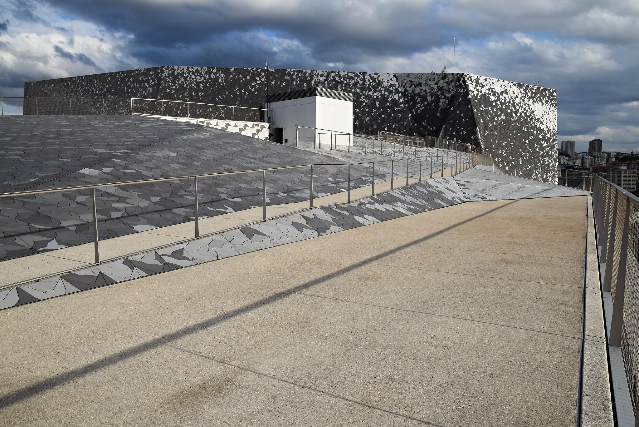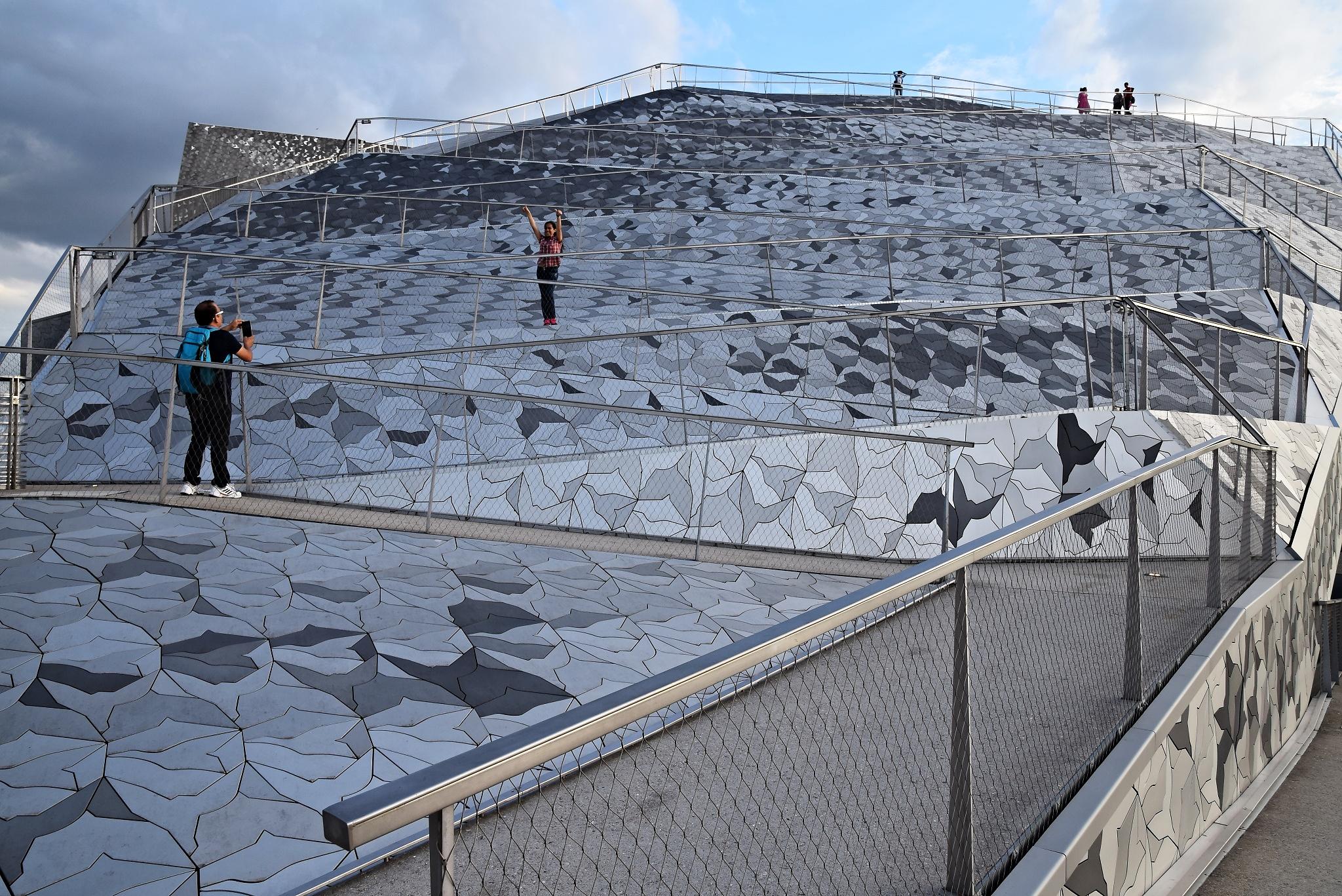 Stavba má tvar horizontálně rozříznutého kopce z hliníku, povrchově upraveného do tvaru nepravidelných dlaždic v různých odstínech šedé barvy. Dovnitř vede široké schodiště.