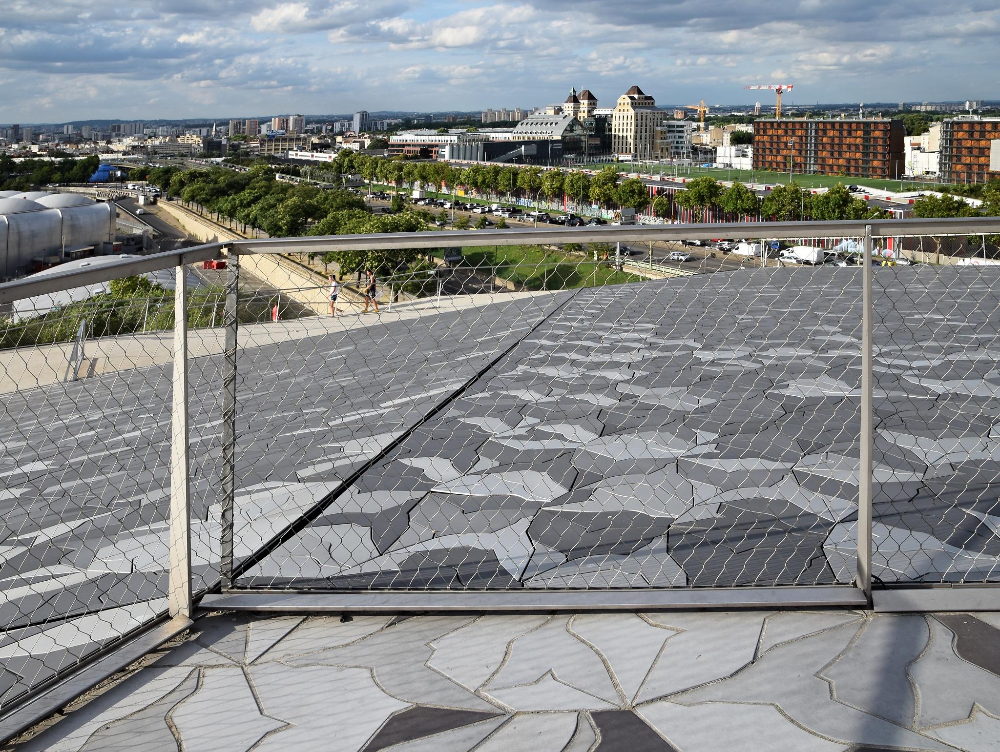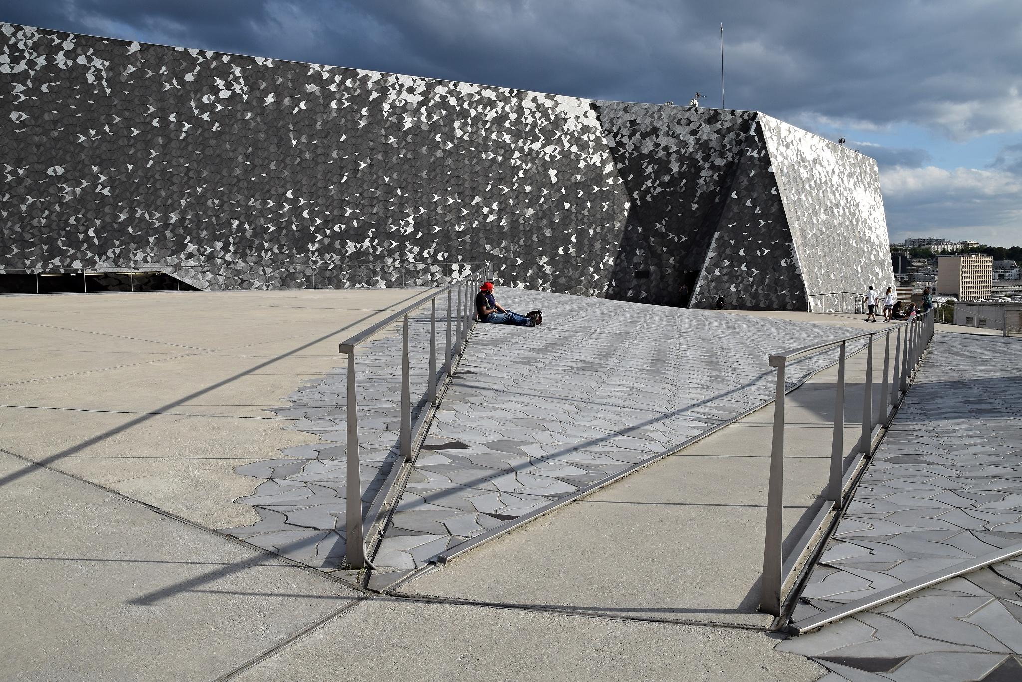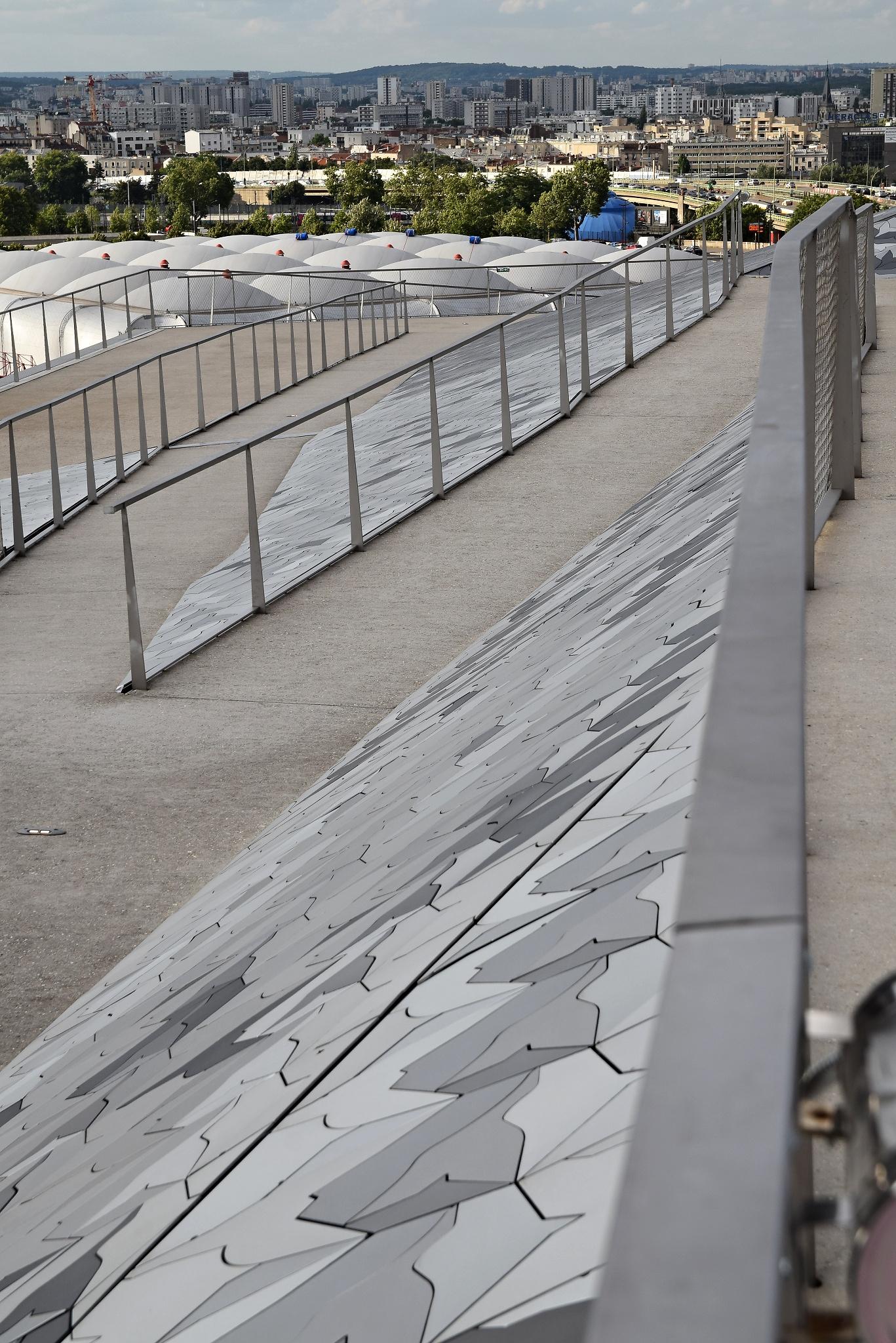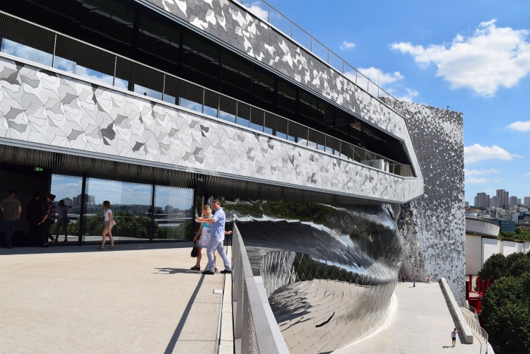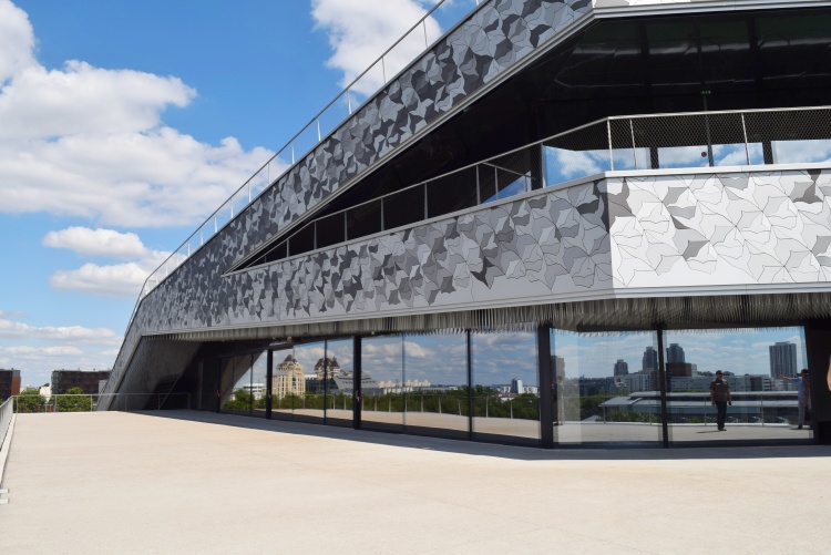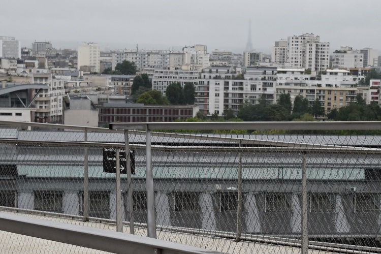 O samotné budově si můžete přečíst ve starém článku TADY. Tehdy jsem ovšem ještě nevěděla, že je vybavena venkovními výtahy, které končí až na střeše. Ta je z jedné strany ohrazená vysokou částí stavby, která ji přesahuje, a ze tří stran je volná a lemovaná zábradlím. Za ním se rozprostírají úžasné výhledy nejen na celý Parc de la Villette, na jehož začátku budova stojí, ale také na velkou část severovýchodní Paříže a v podstatě na všechny vysoké budovy ve městě, včetně věží kostelů a, jak uvidíme, i Eiffelovky.
