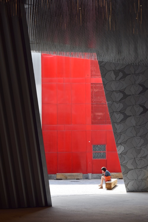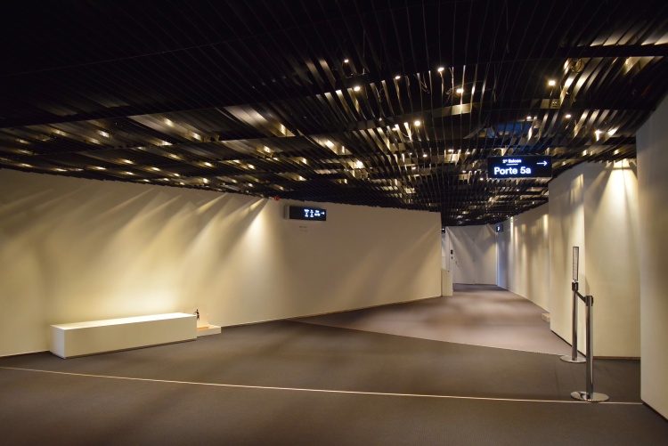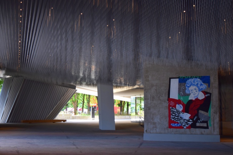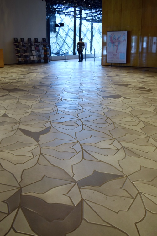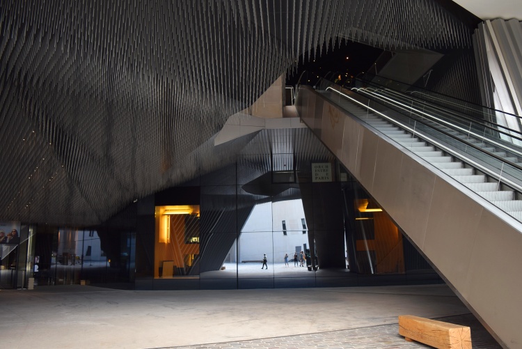 Kromě mohutného schodiště se diváci dostanou dovnitř i po eskalátoru, napůl skrytém právě za schodištěm. My jsme měli domluvenou komentovanou prohlídku a proto jsme měli možnost využít služební vchod v přízemí. To nám také umožnilo prohlédnout si přízemní prostory, všimnout si průhledů mezi jednotlivými částmi budovy a zaznamenat všechny nápadité detaily.