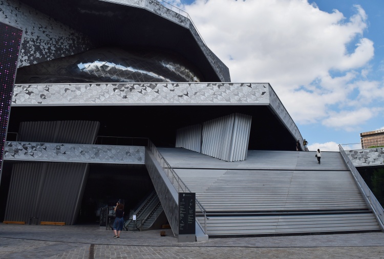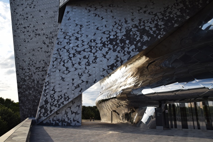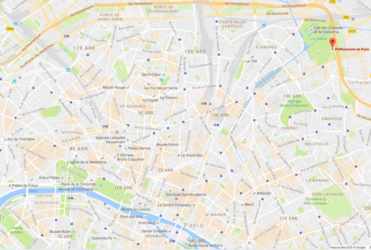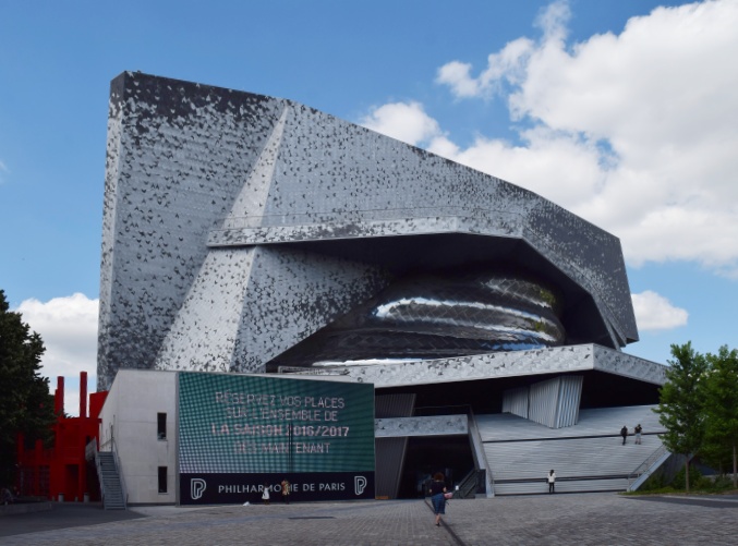 Nová budova filharmonie, která vyrostla v 19. obvodu v areálu parku de la Villette, byla otevřená v lednu 2015. Stojí v těsném sousedství dalšího komplexu koncertních sálů a hudebních učeben Cité de la Musique (který se tak stal její součástí a který tady taky brzo ukážu), přímo naproti pařížské konzervatoře a jen kousek od koncertního sálu Le Zénith. Na severovýchodě města tak byl vytvořen jedinečný komplex budov, věnovaných hudbě, které se vyznačují moderní a nápaditou architekturou.