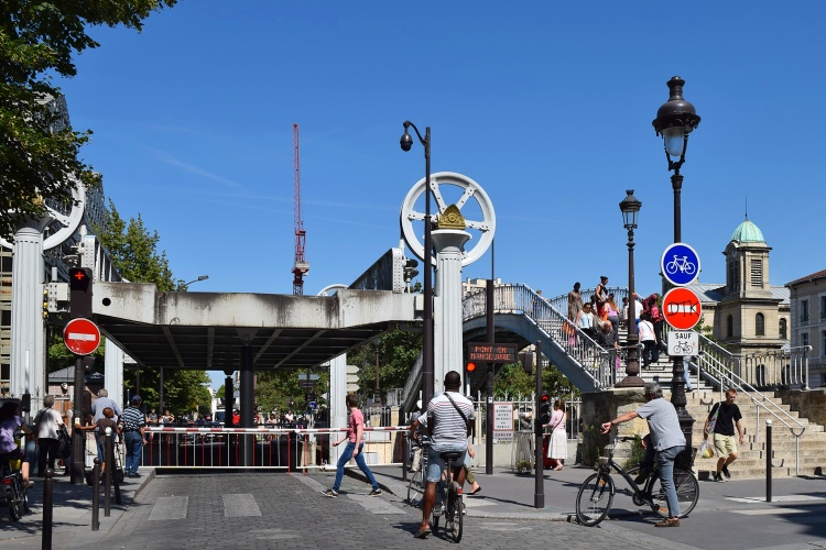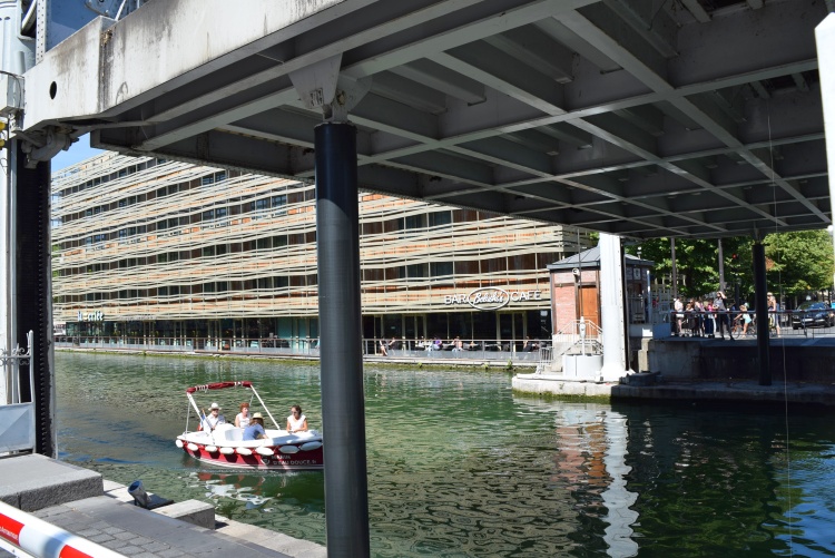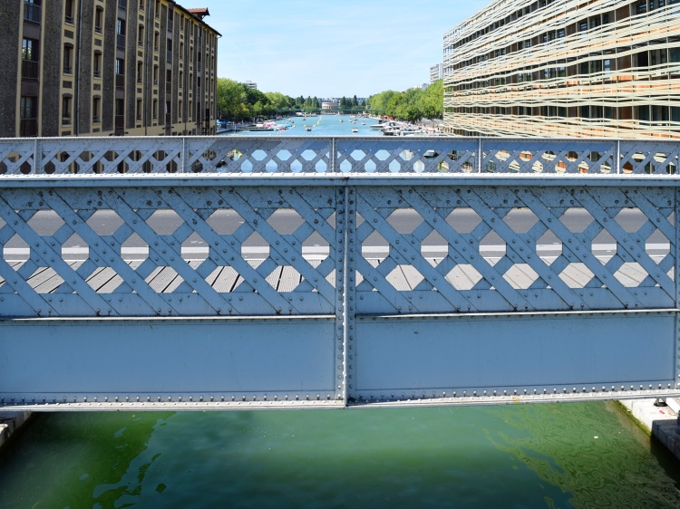 Ten zajímavý most jste tady už jednou viděli, ale stejně si to neodpustím a připomenu ho. Stojí totiž za to. Leží jen kousek od kavárny, kterou jsme si prohlédli minule, v místech, kde se Bassin de la Villette zužuje mezi starou budovou skladiště vpravo a novou budovou hostelu vlevo, a kde se z něho stává Canal de l’Ourcq.