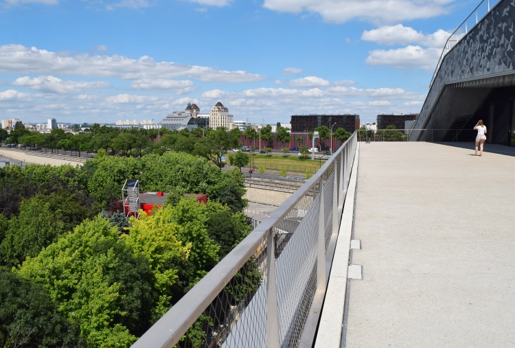 Z terasy je vidět celý Parc de la Villette – tady nahoře třeba vedlejší koncertní sál Le Zénith, dole dohlédneme až na vysoké budovy bývalých mlýnů v obcí Pantin těsně za periferní okružní dálnicí, ve kterých dnes sídlí banka BNP Parisbas.