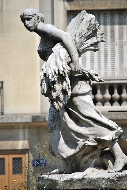 Uprostřed náměstí někam pospíchá dívka se snopem obilí pod paží. Nevím, jestli v češtině existuje slovo „žnečka“ (od slova žnec), ale přesně tak se socha Léona Deschampse jmenuje.