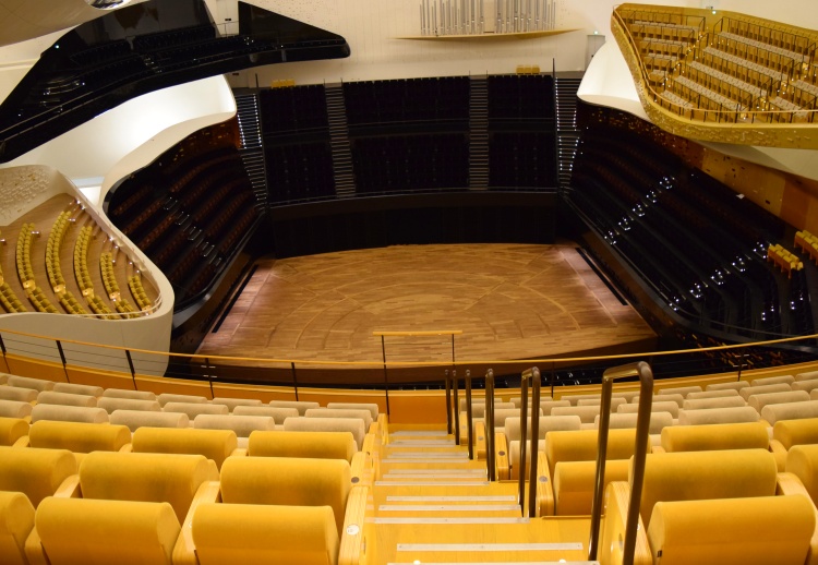 To, co každého návštěvníka zajímá asi nejvíc, je velký koncertní sál. Vejde se do něj 2400 diváků, přičemž díky speciálně až na „dně kotle“ umístěnému jevišti žádný z nich není od dirigenta dál, než maximálně 32 metrů.