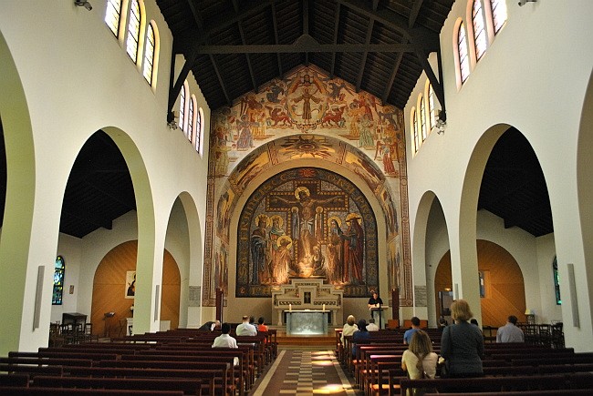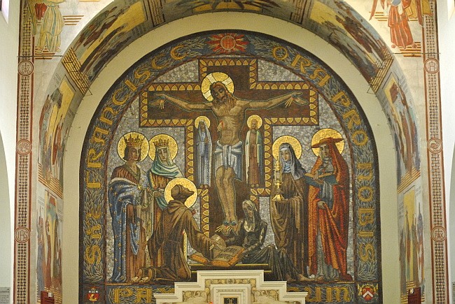 Barevné mozaiky v kněžišti, které napodobují byzantský styl, představují sv. Františka, který klečí před Kristem na kříži, po jeho boku stojí Marie a sv. Janem. Vpravo od kříže vidíme další františkánské svaté, sv. Kláru a sv. Bonaventuru, vlevo potom sv. Ludvíka a sv. Alžbětu Uherskou.