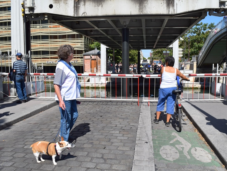 Most pochází z roku 1885 a dnes už je památkově chráněný. Spojuje oba břehy kanálu a ve zvednuté poloze zároveň umožňuje, aby pod ním mohly proplouvat lodě. Viděla jsem ho nahoře už několikrát a vždycky to vytažení a spuštění bylo rychlé, proto mě tentokrát trochu udivilo, že byl nahoře už když jsem se k němu z dálky blížila a že zůstával pořád ve stejné poloze, i když už pod ním pak nic nepodeplouvalo. Most, ovládaný centrálně na dálku, se zkrátka zasekl.