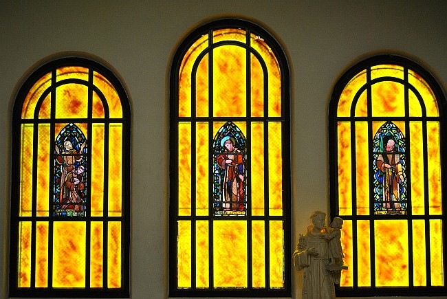 Vitrážová okna představují život Panny Marie a sv. Františka
