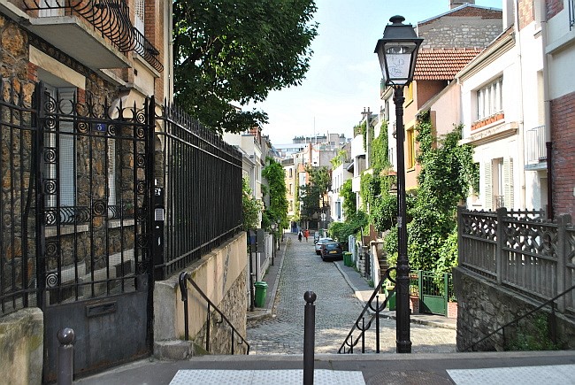 a tvoří, je překrásný výhled na Montmartre (až na ten jeřáb, samozřejmě). Za plotem, který obkružuje konec ulice, leží v prudkém svahu jedna z těch kolektivních zahrádek, kterým se v Paříži tak daří a kterou tady obhospodařují obyvatelé kopce.