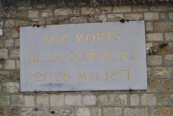 Pařížská Komuna, povstání pařížských občanů, kteří bojovali proti rozhodnutí republikánské vlády vzdát se pruské okupaci a proti podpisu Versailleského míru, se na jaře roku 1871 chýlila ke konci. Vládní vojsko poráželo jeden ostrov odporu ve městě za druhým a na konci krvavého květnového týdne, který přinesl vysoký počet obětí, se posledních 147 komunardů stáhlo na hřbitov Père-Lachaise, kde se opevnili a po čtyři dny zde vládním jednotkám vzdorovali. 28. května 1871 byli po těžkých bojích mezi hrobkami poraženi, postříleni u zdi v jihovýchodní části hřbitova a pohřbeni do hromadného hrobu. Jejich boj se stal symbolem boje za svobodu a ideály. Tento symbol byl bohužel později často zneužíván komunistickou propagandou (Karel Marx tvrdil, že Komuna představovala jediný francouzský příklad diktatury proletariátu).