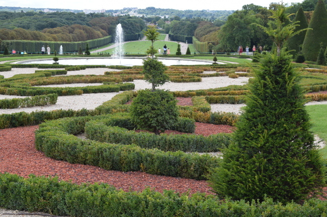 Parter přímo před zámkem je rozčleněný květinovými záhony a nechybí ani fontány. O kousek dál nás dlouhé řady stromů a keřů, ztrácející se v dalekých perspektivách, vedou do anglického parku a hlavně k terase, kterou Le Nôtre nechal vybudovat na terénním zlomu, za kterým se svah prudce láme a spadá směrem k Seině, která obkružuje celé městečko, stojící na vyvýšenině.