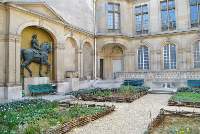 Zatímco Vítězné nádvoří muzea Carnavalet, které jsme viděli minule, bylo vznešené a impozantní, nádvoří Jindřicha IV., přiléhající k sálům, ve kterých jsou vystaveny historické vývěsní štíty, je vlastně jen taková menší zahrádka s prostými bylinkovými záhony, ohrazenými proutím.