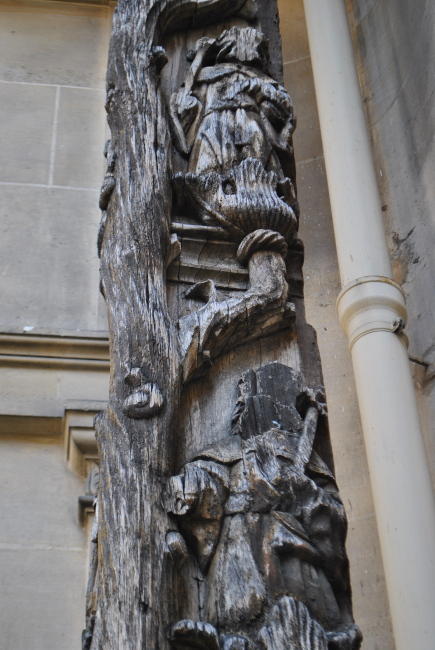 To hlavní, kvůli čemu vás dnes na nádvoří zvu, ovšem výjimečně není Jindřich IV., ale vysoký dřevěný sloup, který stojí v jednom z rohů. Jde o l´Arbre de Jessé, Jišajův strom, bývalé domovní znamení ze 14. století, které do roku 1900 stávalo na rohu jednoho z domů v rue Saint-Denis, a které znázorňuje genealogický strom Ježíšovy rodiny (Jišaj byl otcem krále Davida a dědem Šalamouna a z jejich rodu pochází i Josef, Ježíšův otec). Dům byl sice zbořen, ale devět metrů vysoký sloup byl zachován a uložen v muzeu.