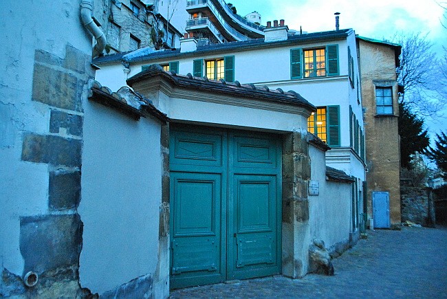 Vchod do domu z rue Berton. Velký kámen po pravé straně vrat není jen tak obyčejný patník. Je to hraniční kámen z roku 1731, který označoval panství Auteil a Passy. Ten Balzaca ještě pamatuje.