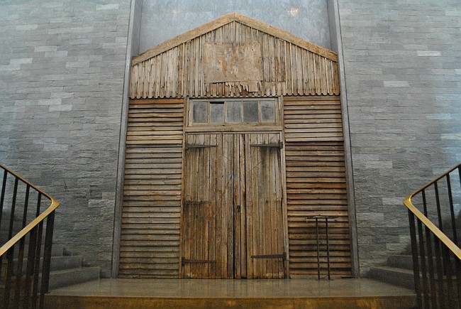 Na zdi naproti schodišti, kterými se sestupuje do krypty, je umístěná část původního baráku z internačního tábora Beaune-la-Rolande