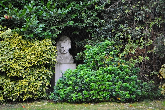 Nejkrásnější je zde ale zahrada – nebo spíše zahrádka, protože je to jen kousek trávníku a pár stromů – která představuje zelený ostrov klidu a ve které je umístěno mnoho Zadkinových bronzových soch.