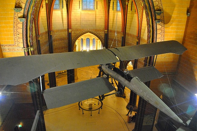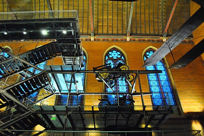 Po celé jedné straně prostoru bývalého kostela je vybudována ocelovo-skleněná rampa, na které jsou umístěny rozměrné exponáty starých automobilů (a nejen starých, najdete tady taky jednoho Renaulta jako Formuli 1) a různých parních strojů, pod stropem jsou potom zavěšeny první letouny. Na rampu se dá vystoupat a dostat se tak až téměř pod strop kostela – tento pohled z výšky pro mně byl bez pochyby jeden z nejsilnějších dojmů.
