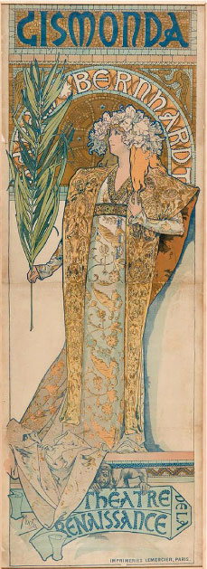 První plakát pro Sarah Bernhardt ve hře Gismonda, který Muchu proslavil